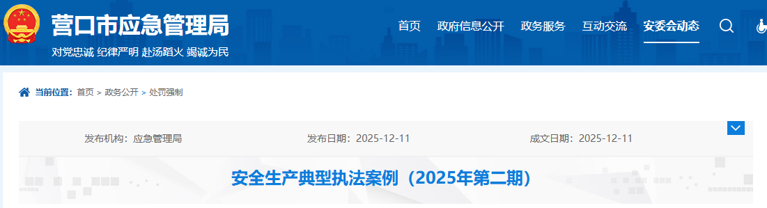 2025年營口市安全生產(chǎn)治本攻堅三年行動縱深推進以來,全市各級應(yīng)急管理及住建、交通、市場監(jiān)管等部門,聚焦“八大重點領(lǐng)域”和重大事故隱患,持續(xù)以交叉互檢、聯(lián)合執(zhí)法、行刑銜接等方式開展精準監(jiān)管,嚴查重處各類非法違法經(jīng)營行為,切實推動企業(yè)主體責任落地見效,實現(xiàn)重大隱患動態(tài)清零。為深化典型案例警示教育成效,強力震懾安全生產(chǎn)領(lǐng)域違法違規(guī)行為,現(xiàn)將營口市安全生產(chǎn)重點執(zhí)法部分典型案例予以公布。