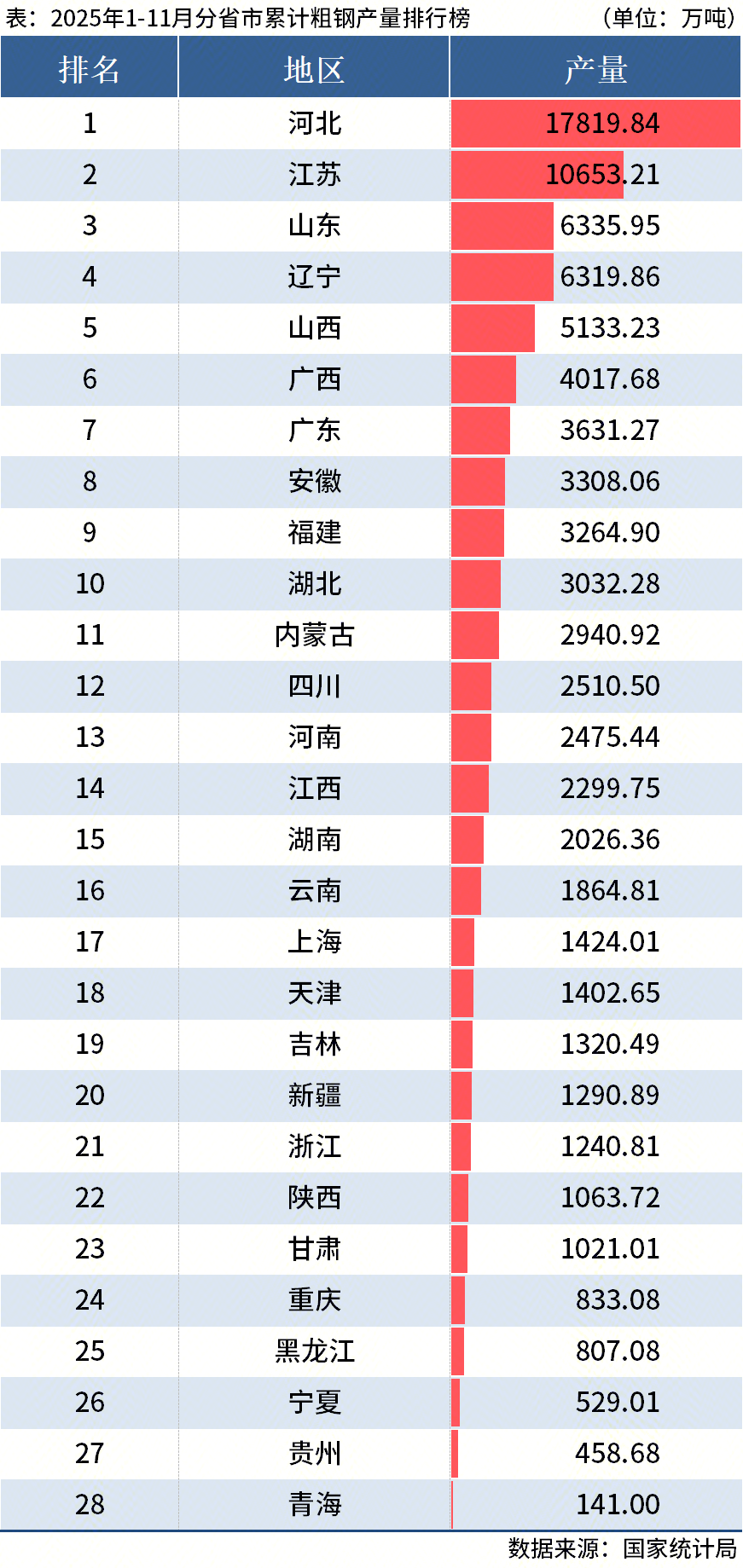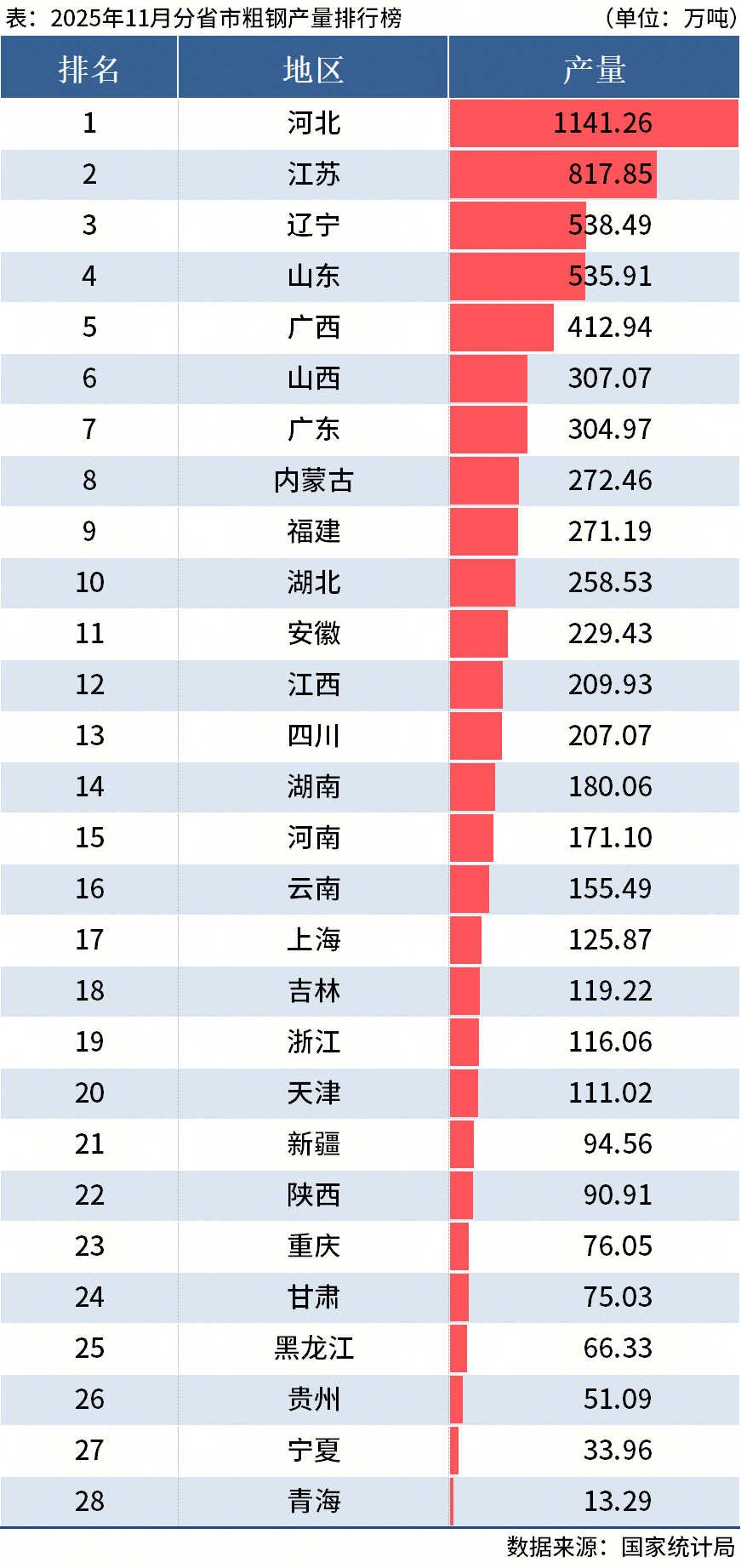 國(guó)家統(tǒng)計(jì)局?jǐn)?shù)據(jù)顯示,2025年11月中國(guó)粗鋼產(chǎn)量6987.1 萬(wàn)噸,同比下降10.9%;1-11月累計(jì)粗鋼產(chǎn)量89166.5 萬(wàn)噸,同比下降4.0%。