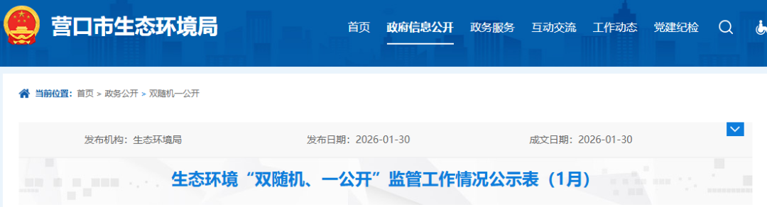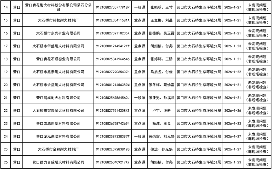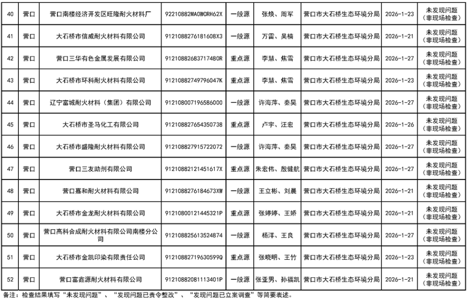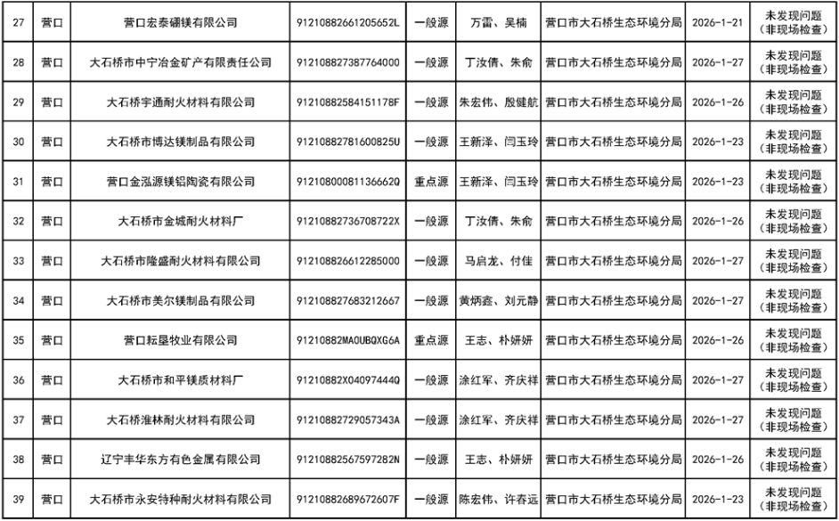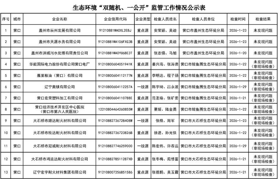 營口市生態(tài)環(huán)境局公示對(duì)遼寧奧鎂、宏宇耐火等52家企業(yè)“雙隨機(jī)、一公開”監(jiān)管工作情況