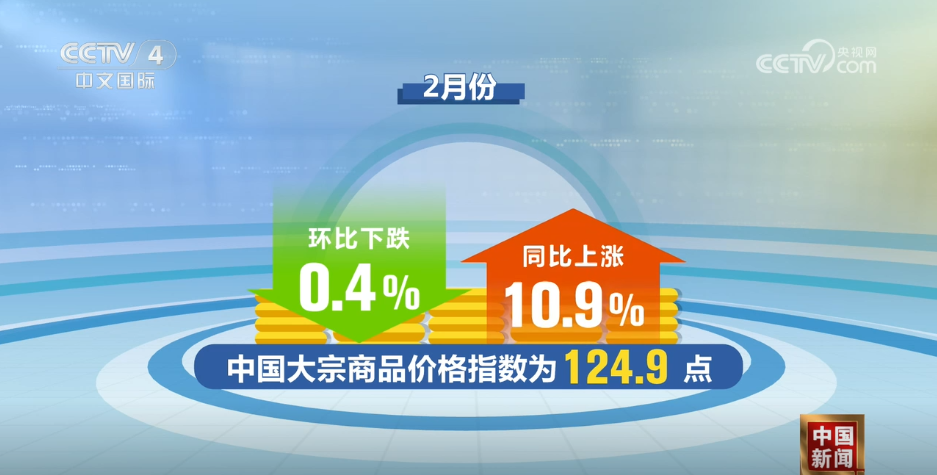 2月份中國大宗商品價格指數(shù)為124.9點,環(huán)比下跌0.4%,同比上漲10.9%。在中國物流與采購聯(lián)合會重點監(jiān)測的50種大宗商品中,2月價格環(huán)比上漲的大宗商品有24種。其中,氧化鐠釹、丁苯橡膠和聚氯乙烯漲幅居前,較上月環(huán)比分別上漲24.3%、5.4%和3.5%。
