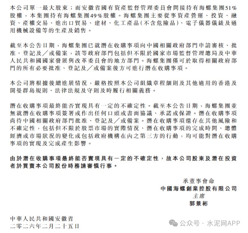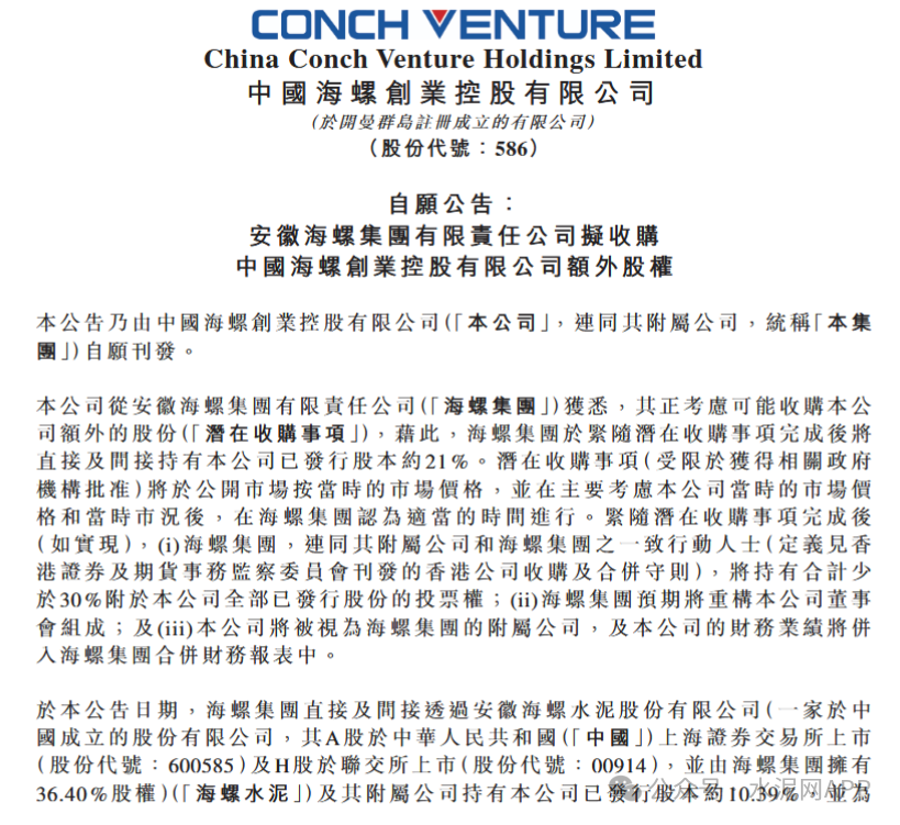 2月25日晚間,海螺創(chuàng)業(yè)發(fā)布公告,安徽海螺集團有限責任公司正考慮可能收購公司額外股份。收購?fù)瓿珊螅B菁瘓F將直接及間接持有公司已發(fā)行股本約21%。