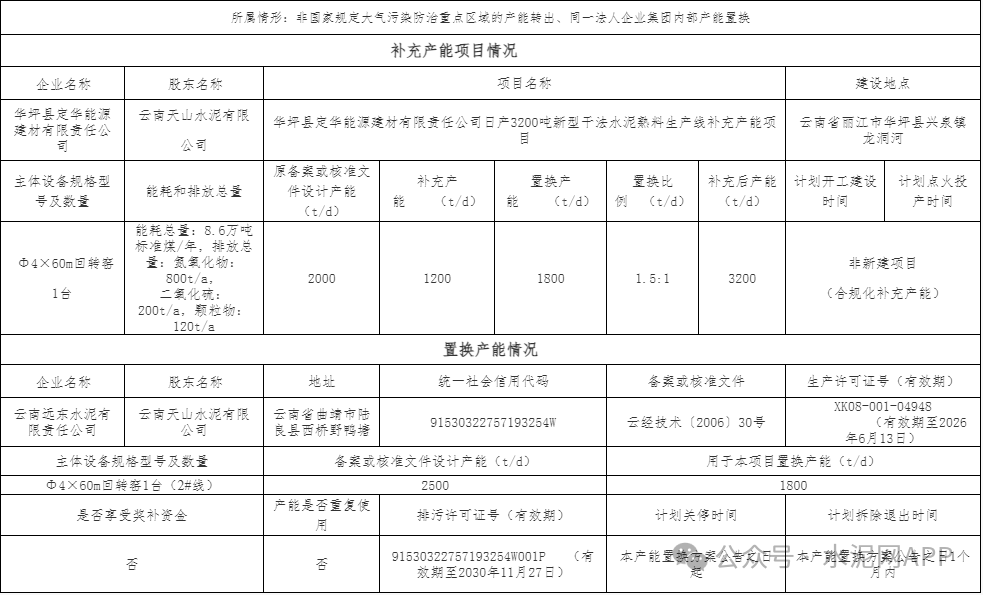 云南遠(yuǎn)東水泥退出一條2500t/d熟料生產(chǎn)線,其中1800t/d產(chǎn)能用于補(bǔ)充華坪縣定華能源建材一條2000t/d熟料線,補(bǔ)齊后產(chǎn)能3200t/d。置換比例1.5:1。