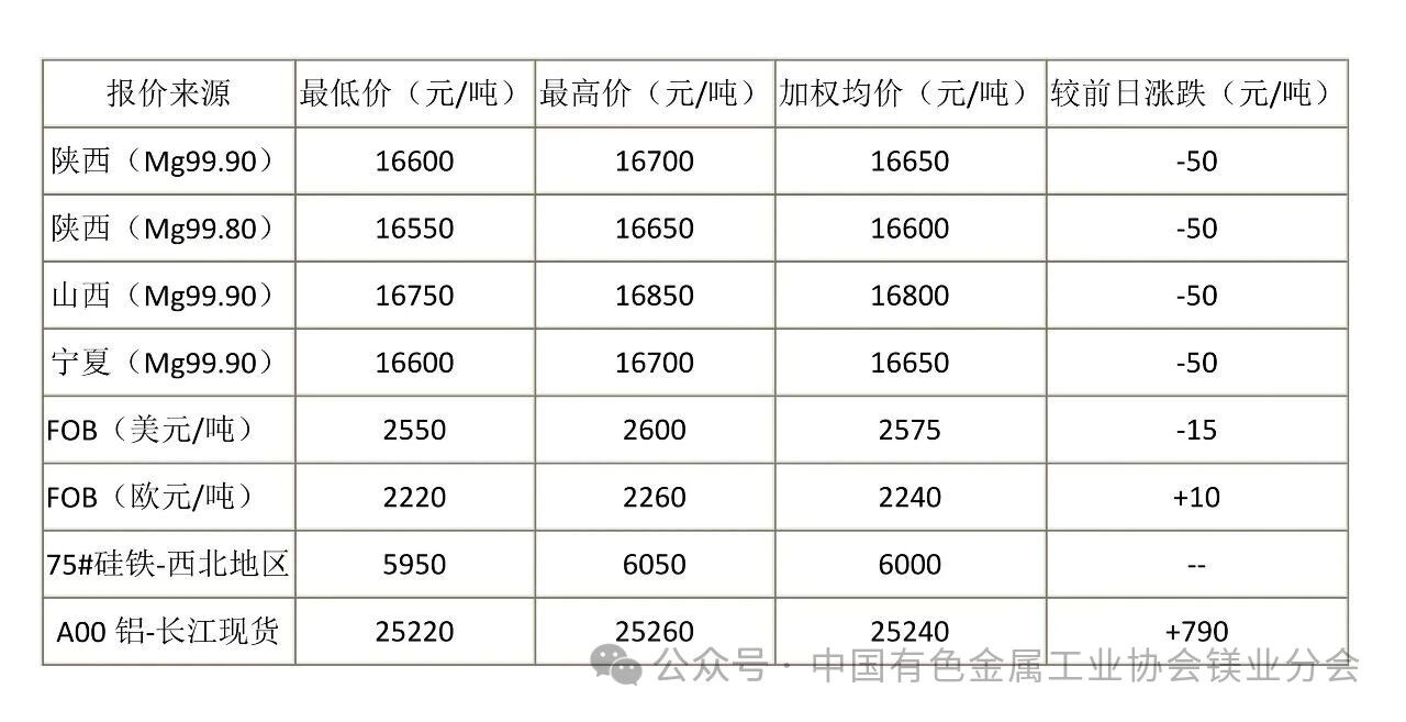 2. 原鎂報(bào)價(jià)為按照?qǐng)?bào)價(jià)企業(yè)產(chǎn)量加權(quán)計(jì)算后所得平均值,并按50元/噸取整;3. 表中價(jià)格均為現(xiàn)貨含稅、現(xiàn)金、不酸洗價(jià),國(guó)內(nèi)單位為元/噸;4. FOB為天津港離岸價(jià)格。