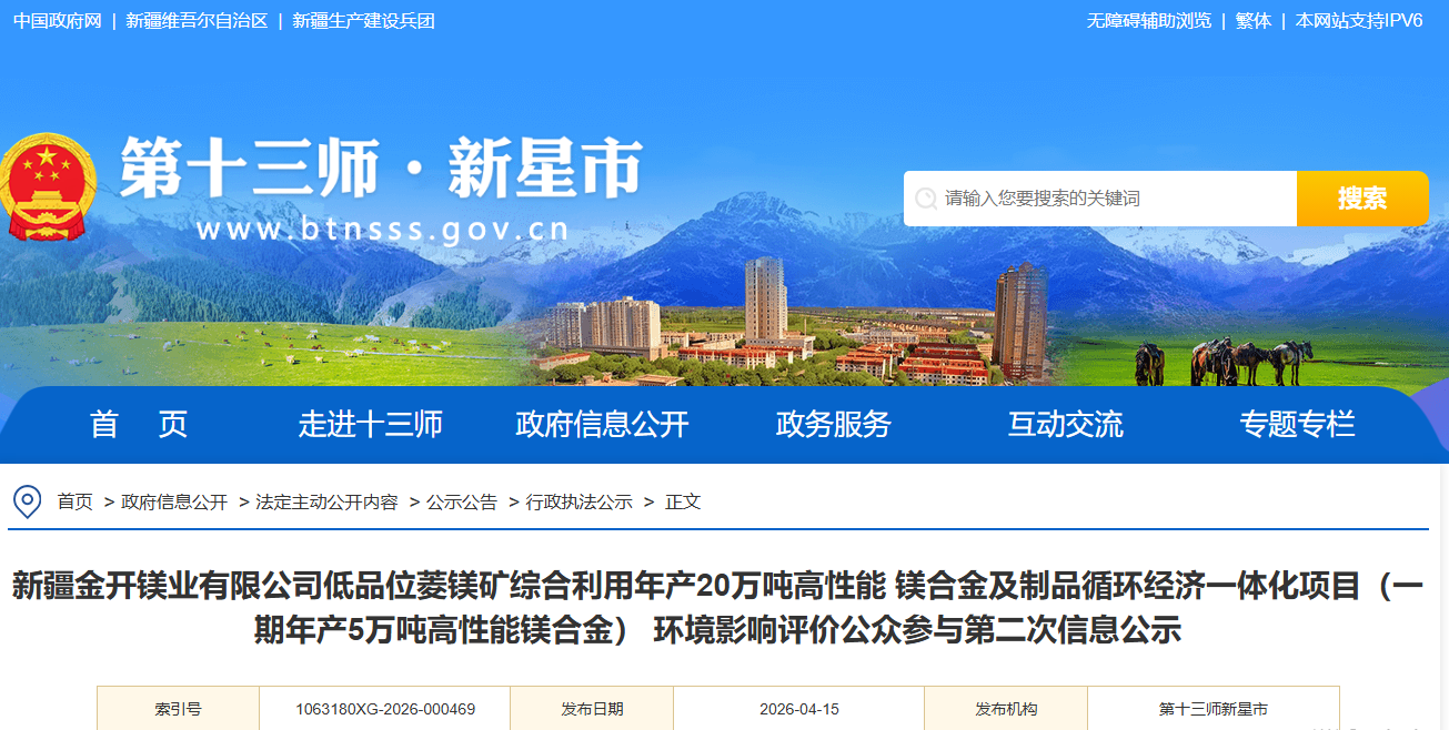 我公司委托新疆辰光啟航環(huán)保技術(shù)有限公司承擔(dān)了“新疆金開鎂業(yè)有限公司低品位菱鎂礦綜合利用年產(chǎn)20萬噸高性能鎂合金及制品循環(huán)經(jīng)濟一體化項目(一期年產(chǎn)5萬噸高性能鎂合金)”的環(huán)境影響評價工作?,F(xiàn)環(huán)境影響評價單位編制完成了《新疆金開鎂業(yè)有限公司低品位菱鎂礦綜合利用年產(chǎn)20萬噸高性能鎂合金及制品循環(huán)經(jīng)濟一體化項目(一期年產(chǎn)5萬噸高性能鎂合金)環(huán)境影響報告書》(征求意見稿),根據(jù)《中華人民共和國環(huán)境影響評價法》《環(huán)境影響評價公眾參與辦法》(生態(tài)環(huán)境部令第4號)等法律法規(guī)及相關(guān)規(guī)定,現(xiàn)對該項目進行公眾參與第二次信息公開,請社會公眾對該報告提出意見和建議。公示材料如下: