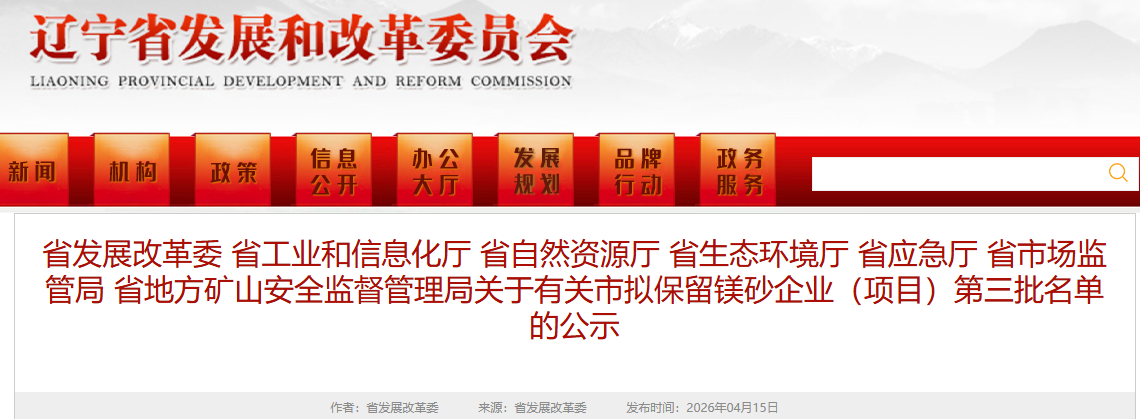 根據《遼寧省人民政府辦公廳關于推進菱鎂行業(yè)高質量發(fā)展的實施意見》(遼政辦發(fā)〔2023〕15號)、《遼寧省人民政府辦公廳關于印發(fā)遼寧省菱鎂行業(yè)專項整治方案的通知》(遼政辦發(fā)〔2023〕34號)要求,有關市政府向省菱鎂行業(yè)高質量發(fā)展領導小組辦公室報送了本市擬保留鎂砂企業(yè)(項目)名單,同時對部分已公示項目進行了調整?,F將相關企業(yè)(項目)名單有關情況面向社會公示,公示期5個工作日。